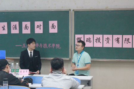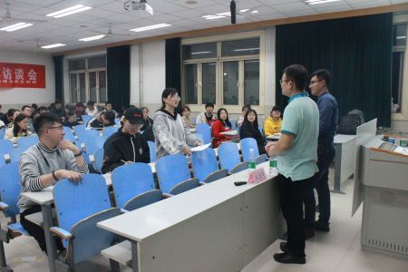 访谈会中,王奎军经理从自身经历谈起,分享了其毕业后对于自己是否适合读研的思考,勉励同学们尽早地进行职业生涯规划。随后,李成军经理给同学们分享了参加面试以及个人实习的经验,同时他希望同学们在未来的工作中能够树立起自己的职业价值观从而成就自我人生价值。随后,主持人就一些常见问题向王奎军经理提问。王经理的回答风趣幽默,他向同学们分享了如何应对职场中压力的方法,讲授了一些应对面试的建议以及小技巧,为我们指明了今后努力的方向。访谈会末,王奎军经理和同学们进行了面对面的交流,许多同学踊跃发言并提出了自己的疑问,王经理耐心解答相关问题并提出了中肯建议,之后许多同学提交了自己的求职申请书并积极与王经理进行交流,访谈会到此结束。