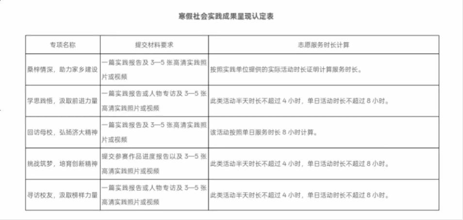 参与实践的学生需在以上五个专题之中至少选择一个进行实践,同一活动只能选择一个专题进行申报。寒假社会实践结束后需并按照《实践服务时长计算标准》提交材料。本次寒假社会实践材料分两次收集,分别为2月5日和2月20日,请同学们做好时间安排,及时提交社会实践材料。认定寒假社会实践时长低于16个小时,将不得参与2025年度社会实践评奖评优。