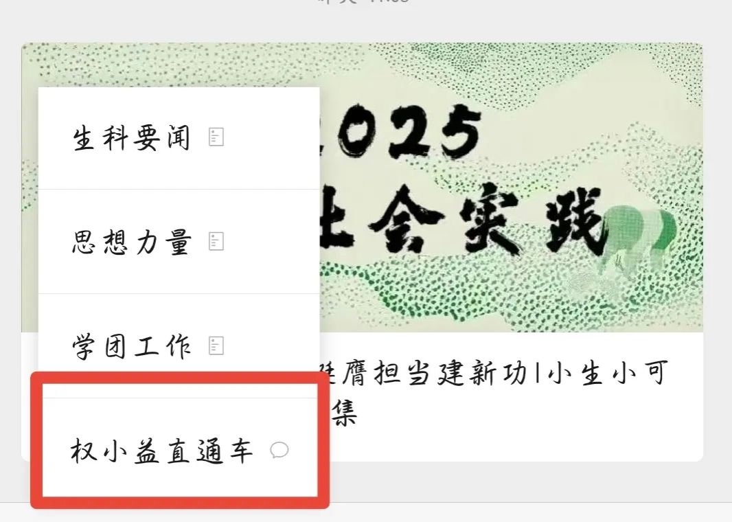 二、关注“济大生科院SKY”微信公众号,点击公众号中左下角的“卓越生科-权小益直通车”反馈问题。