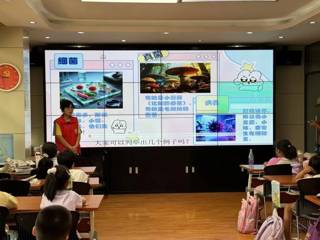 在微生物科普活动中,志愿者们从生活中常见的微生物切入,生动讲解了细菌、真菌、病毒的特点、分类及日常注意事项,孩子们听得专注投入,不时踊跃举手互动。活动还设计了区分大肠杆菌、酵母菌、乳酸菌的小游戏,通过转圈圈、旋转跳跃等趣味运动,让孩子们在轻松氛围中加深了对微生物的认识,也提升了科学探究的兴趣。