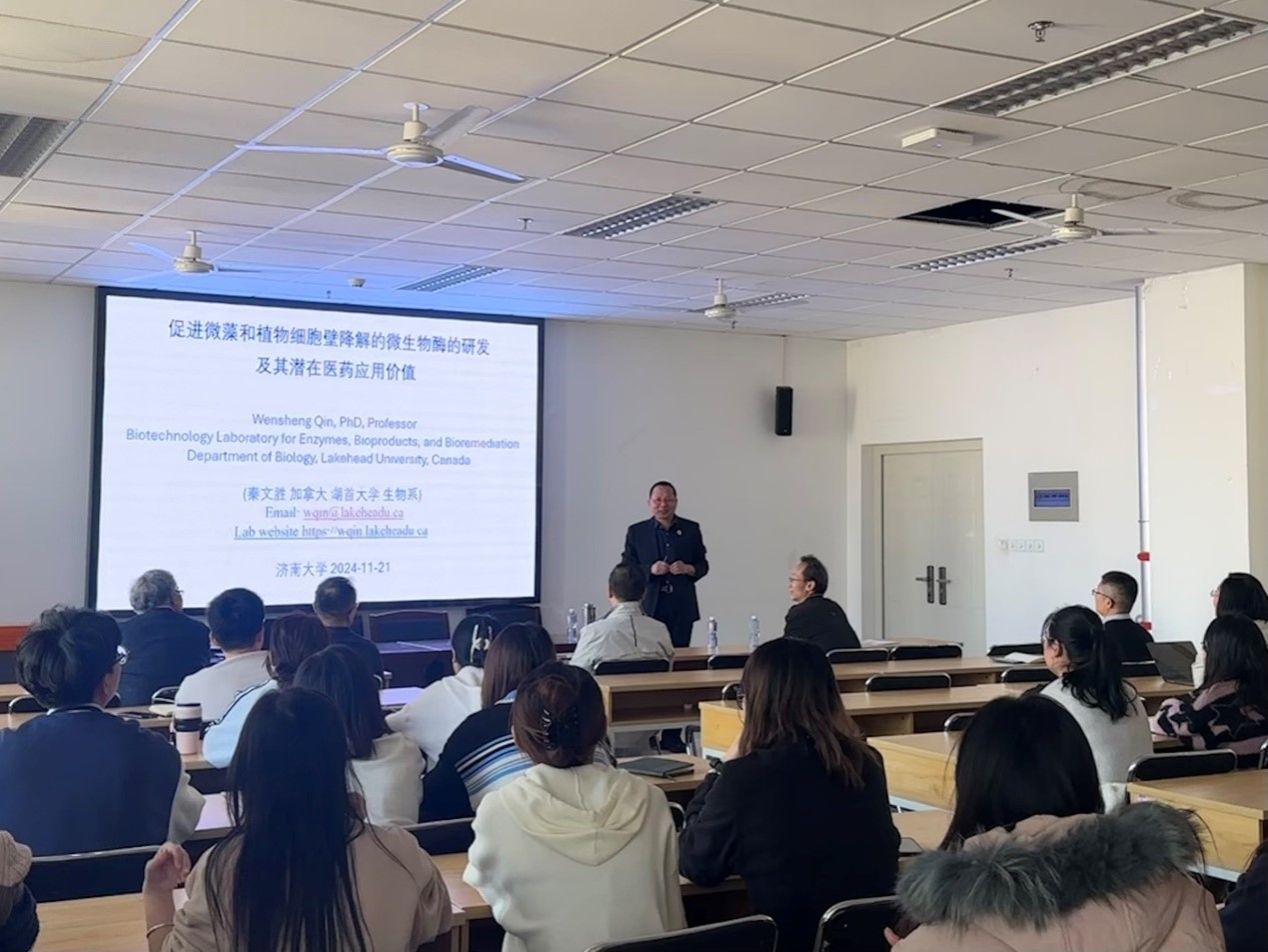 11月21日,加拿大湖首大学(Lakehead University)终身教授秦文胜应邀来LETOU国际米兰官网开展交流,并以“促进微藻和植物细胞壁降解的微生物酶的研发及其潜在医药应用价值”为主题作学术报告,学院教师、学生代表参加活动。报告会由副院长李强主持。