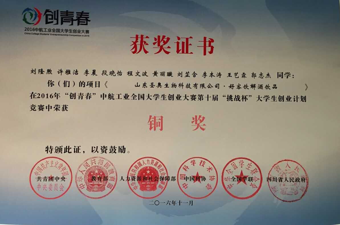 2016年11月15日至20日,由共青团中央、教育部、人社部、中国科协、全国学联、四川省人民政府主办的2016“创青春”中航工业全国大学生创业大赛终审决赛在电子科技大学举行。本届“创青春”决赛主题为“筑梦青春 创享未来”,共有362个项目进入终审决赛,三项主体赛事和主题活动规模6500余人,其中参赛学生423队(含境外高校),约1700人。本届大赛参赛作品数、参赛团队数和参赛学生人数均为历次大赛之最。LETOU国际米兰官网入围的由谷劲松教授指导的实践类作品《山东圣奥生物科技有限公司·好客饮解酒饮品》在2016年全国大学生“创青春”创业大赛中荣获全国铜奖。