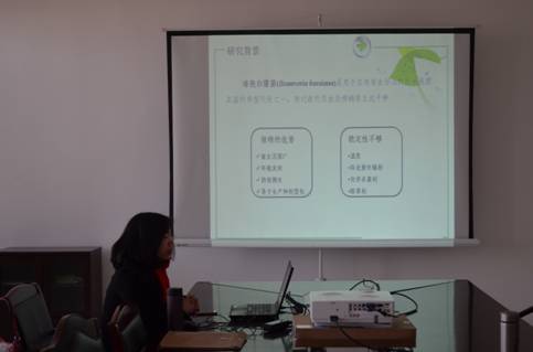 王娟娟老师在报告中给大家介绍了病原真菌球孢白僵菌甘露糖转移酶Ktr家族中三个基因Ktr1、Ktr14、Kre2的功能,并讲解了这三个基因影响球孢白僵菌生物防治潜能的可能机制。与会的老师对王老师的研究表现出浓厚的兴趣,围绕报告内容进行了热烈地讨论。