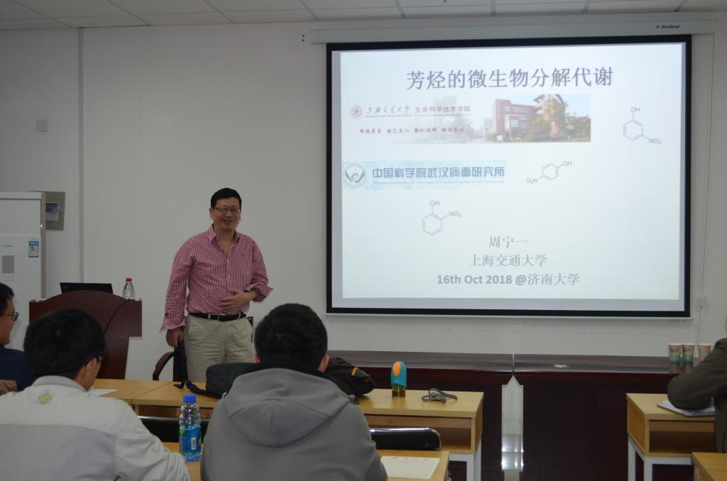 周宁一教授以“芳烃的微生物分解代谢”为题,从硝基酚三种同分异构体的分解代谢、微生物代谢芳香烃的自然进化与人工进化、芳香酸转运蛋白以及原核生物基因组内16SrRNA基因的差异性四个方面阐述了关于芳烃微生物的分解过程的内容。报告会现场气氛热烈,与会师生针对报告内容,结合自己工作过程中遇到的问题,与周宁一教授进行了深入交流。周教授儒雅的气度、严谨的论证、渊博的知识及风趣的语言给与会师生留下了深刻的印象。此次报告会是我院庆祝我校建校70周年系列学术活动与研究生学术节的一部分,旨在为研究生提供一个更广阔的平台,扩展眼界,拓宽知识领域,更好的提升自己的学术水平。