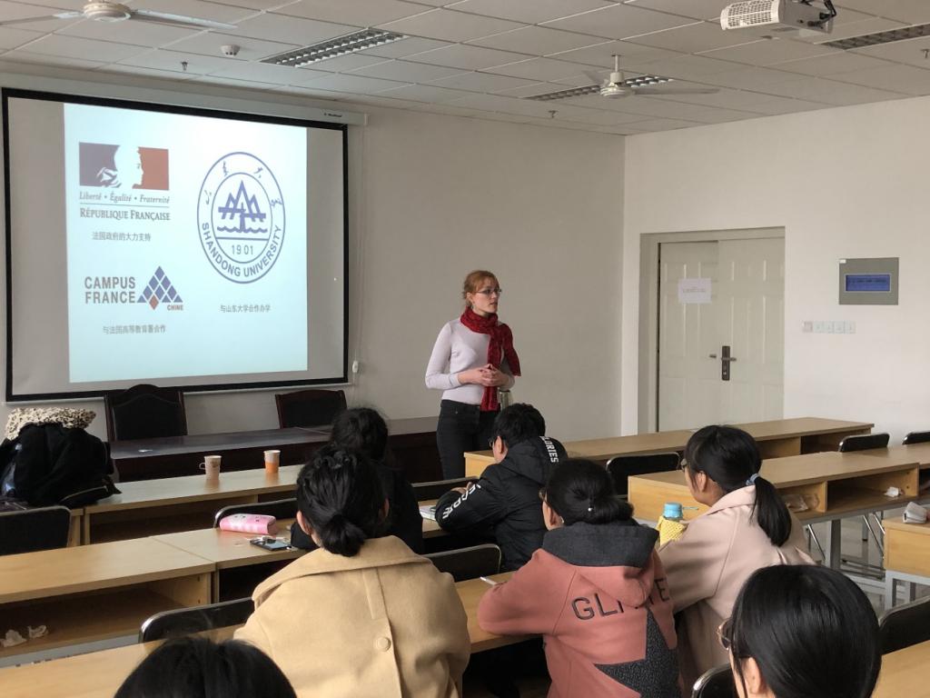 4月10日,法国高等教育署-济南办事处负责人苑姝婧女士、济南法语联盟法方校长MaudMIQUAU女士应邀来我院举办法国留学宣讲会。