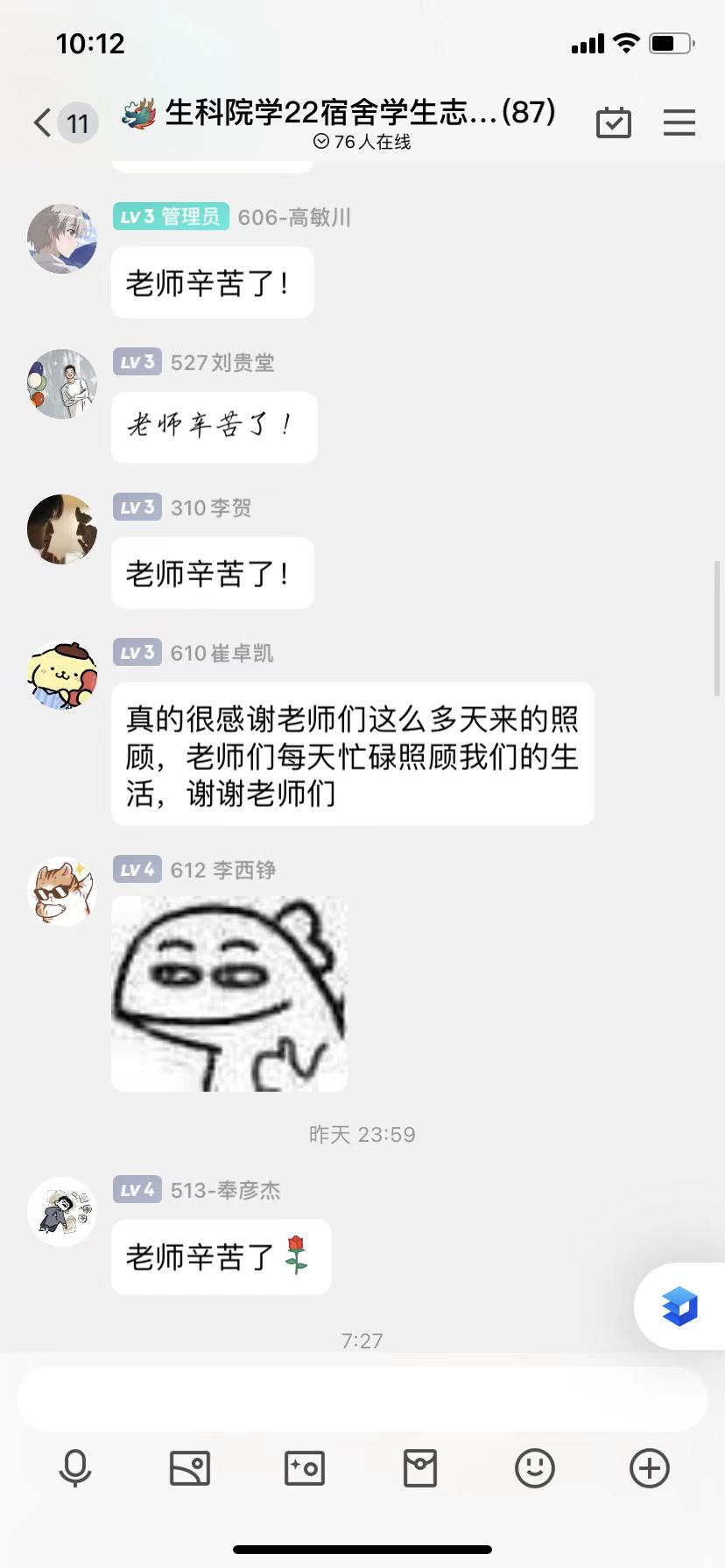 疫情就是命令,防控就是责任。接到学院学生所在公寓楼出现核酸检测阳性病例,楼宇需要实行静默管理的通知后,学院党委高度重视,迅速进入紧急工作状态,根据学校党委部署,开展应对处置工作。制定《公寓楼疫情防控工作方案》,吹响疫情防控“集结号”,号召学院师生共同抗疫。在学院教职工积极响应下,一支由辅导员、班主任、任课教师组成的学生公寓疫情防控专班快速组建,入驻公寓并成立驻楼临时党支部,充分发挥党员先锋模范作用,冲锋在抗疫一线。驻楼专班老师们身穿“大白”,不怕苦累,全心全意服务保障学生生活,当好学生“勤务兵”;稳定学生情绪、了解学生需求、解决学生困难,成为学生“暖心人”。与此同时,学院利用学科优势,组织一支由专业教师组成的核酸检测志愿工作队,为全校师生每日核酸检测工作的高效完成贡献力量。生科院教师以实际行动为党徽增光,为党旗添彩,在战疫前线尽显使命担当。