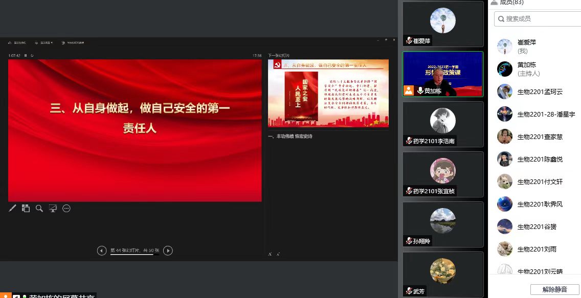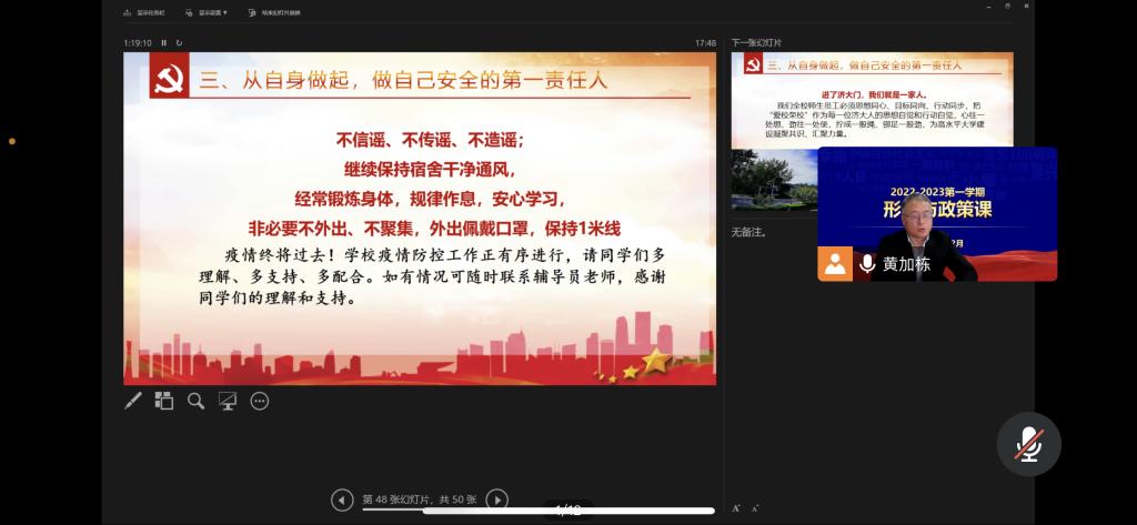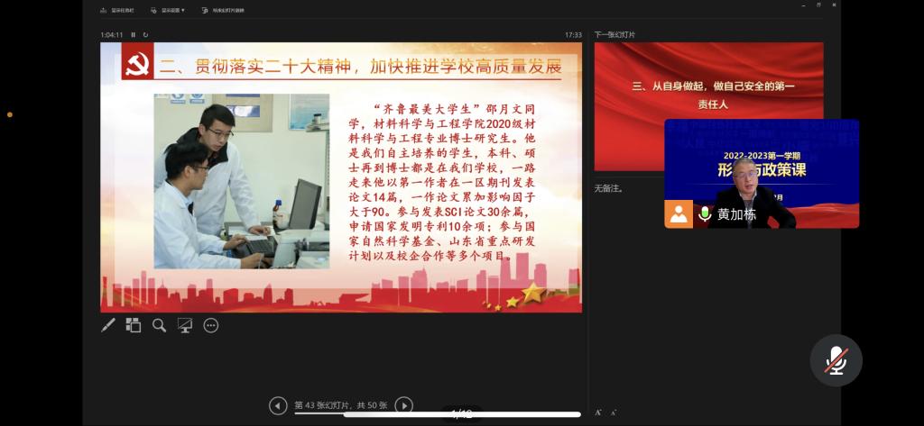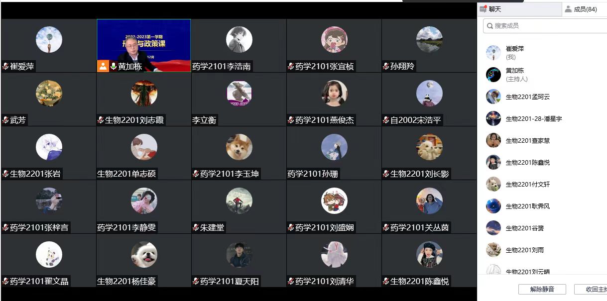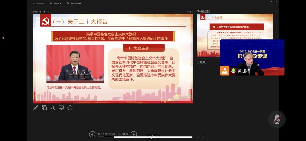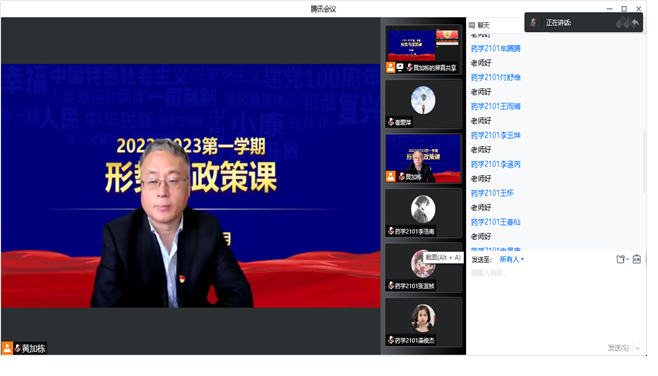 为深入学习宣传贯彻党的二十大精神,充分发挥思想政治理论课主渠道作用,落实立德树人根本任务,12月6日,LETOU国际米兰官网党委常委、副校长黄加栋以在线形式为LETOU国际米兰官网药学2101班、生物2201班学生讲授党的二十大精神专题《形式与政策》课。