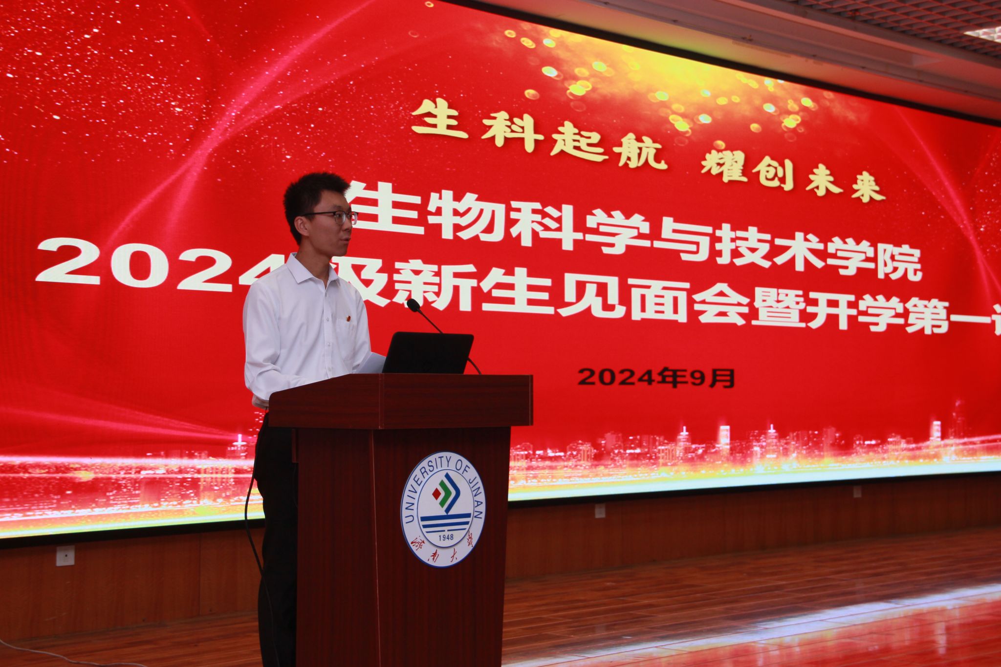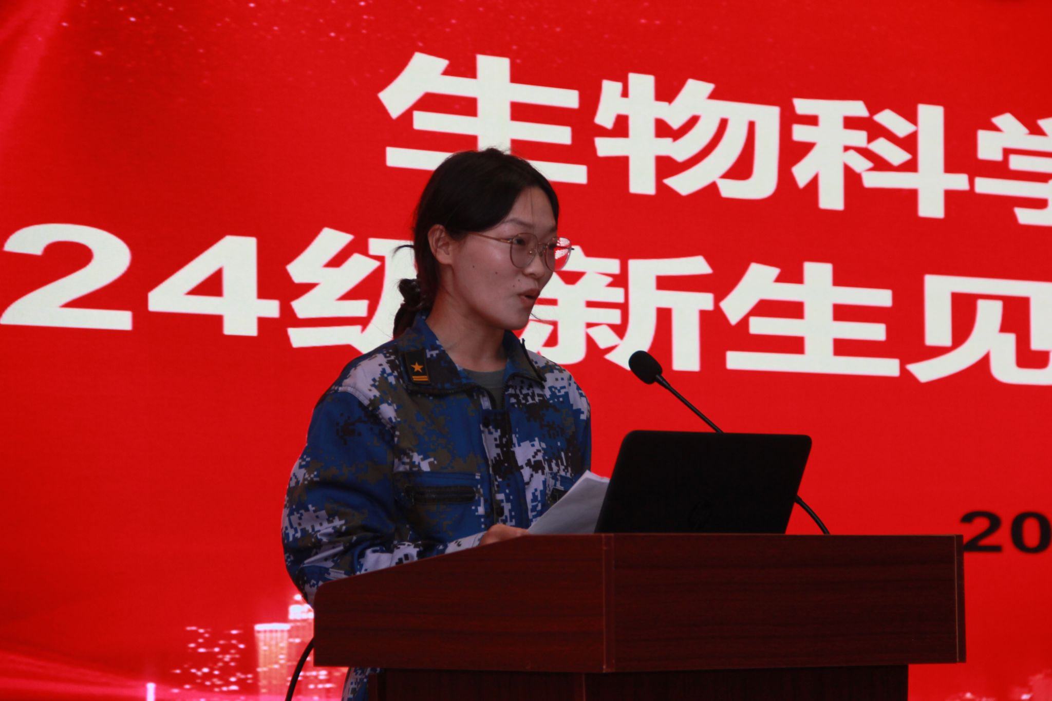 生物专硕2402班宁传奇、生物2402班江晶莹作为新生代表依次发言。他们表达了踏入大学校园的喜悦、对未来学习生活的憧憬,表示将以“理必求真,事必求是,言必守信,行必踏实”的态度探寻生命奥秘,收获个人成长,让青春之光在强国建设的征程中熠熠生辉。