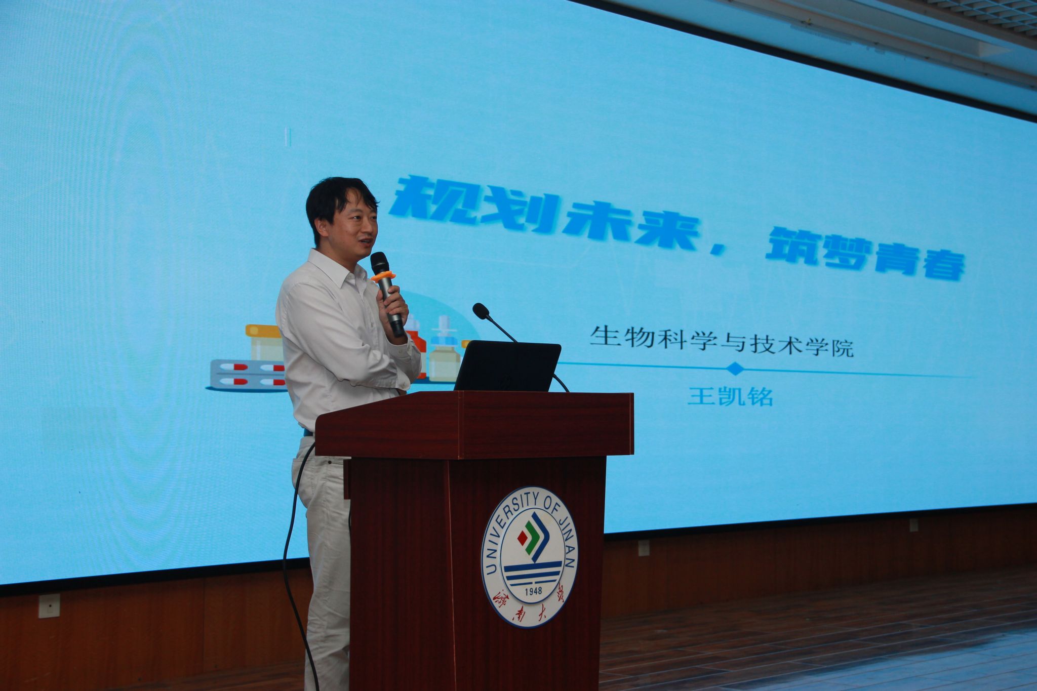 教师代表王凯铭以“规划未来,筑梦青春”为主题,为新生讲授了一堂精彩生动的生涯规划课程。他从自身求学、求职经历谈起,以翔实的数据、生动的语言,从人生目标、生涯规划、工作选择等角度,为初入大学校园的同学们解答生涯困惑、启迪未来方向。